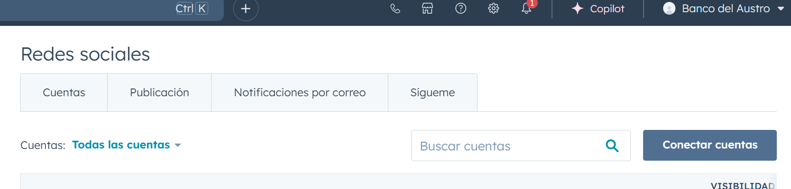 -En la pestaña de redes sociales, busca el botón "Conectar cuentas" (ubicado en la parte superior derecha).